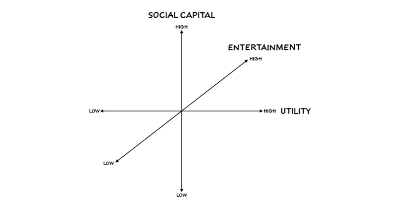 • 分析には3つの軸があります。ソーシャルキャピタル、ユーティリティー、エンターテイメントである。