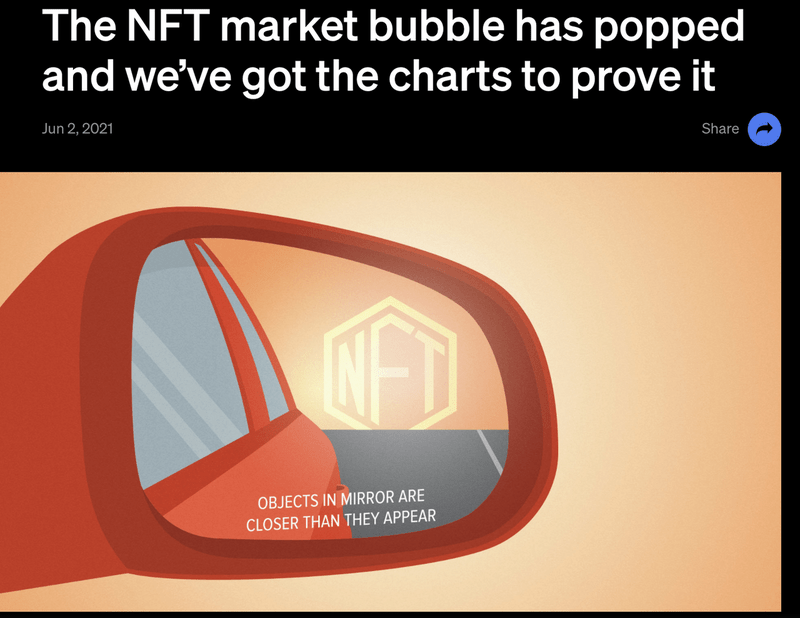 そして、4月には暗号価格が暴落し、それに伴ってNFTも冷え込みました。NFTを信じられない人たちは、「ほら、jpegに何百万ドルも払う人が出てきたときにバブルだとわかったんだよ!」と言っていました。