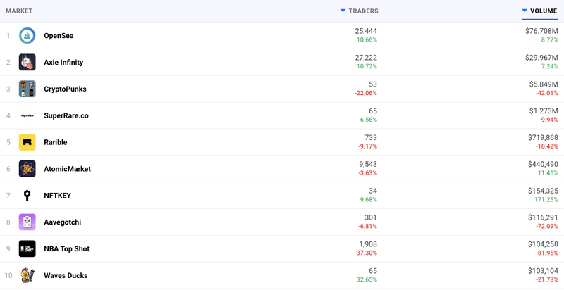 DappRadarによると、過去30日間でトップ10のNFT市場の取引量は18億6000万ドルに達しました。