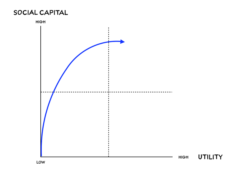 プルーフ・オブ・ワークが変わらないことの危険性は、いずれその社会的通貨を採掘したいと思う人が皆そうしてしまい、そのほとんどが枯渇してしまうことです。その時点で、ソーシャルネットワークに残されたステータス主導のポテンシャルエネルギーの量は平坦になります。その時点で、サービスが多くのユーティリティを付加することに成功していなければ、ネットワークは陳腐化してしまいます。