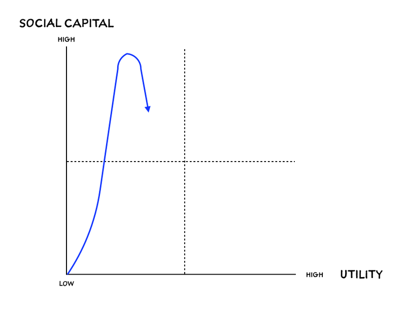 また、ソーシャルキャピタルは腐らないものであるため、捨てやすい傾向にあります。ツイッターのフォロワーが他のネットワークでは何の価値もないのであれば、面倒なことをする価値がなくなれば、アカウントを手放す方が苦痛ではありません。ツイッターやフェイスブックのようなソーシャルネットワークでは、かつてユーザーが自分のグラフを他のネットワークに移植することができました。また、フェイスブックは、サードパーティのサービスやアプリが自分たちのグラフの上に構築することで得られるインバウンドのソーシャルキャピタルの価値を過大評価していたこともありました。